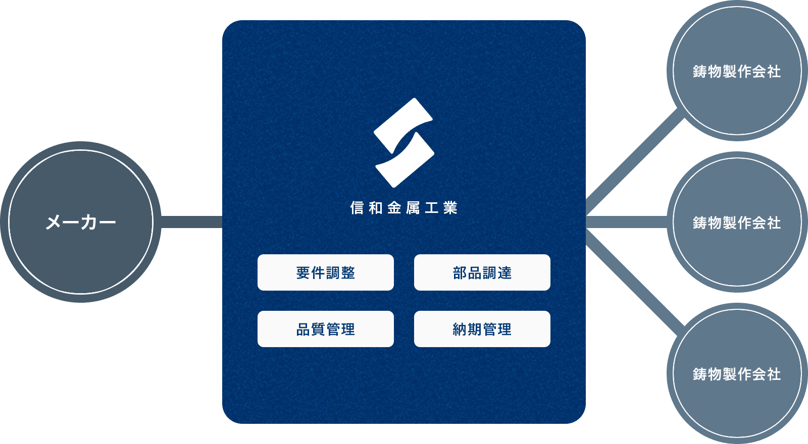 そういった課題を解消するために、当社はメーカーと鋳物製作会社を結ぶ架け橋として、50年の実績と信頼関係を活かし、迅速な対応で、製品の供給を行なっています。